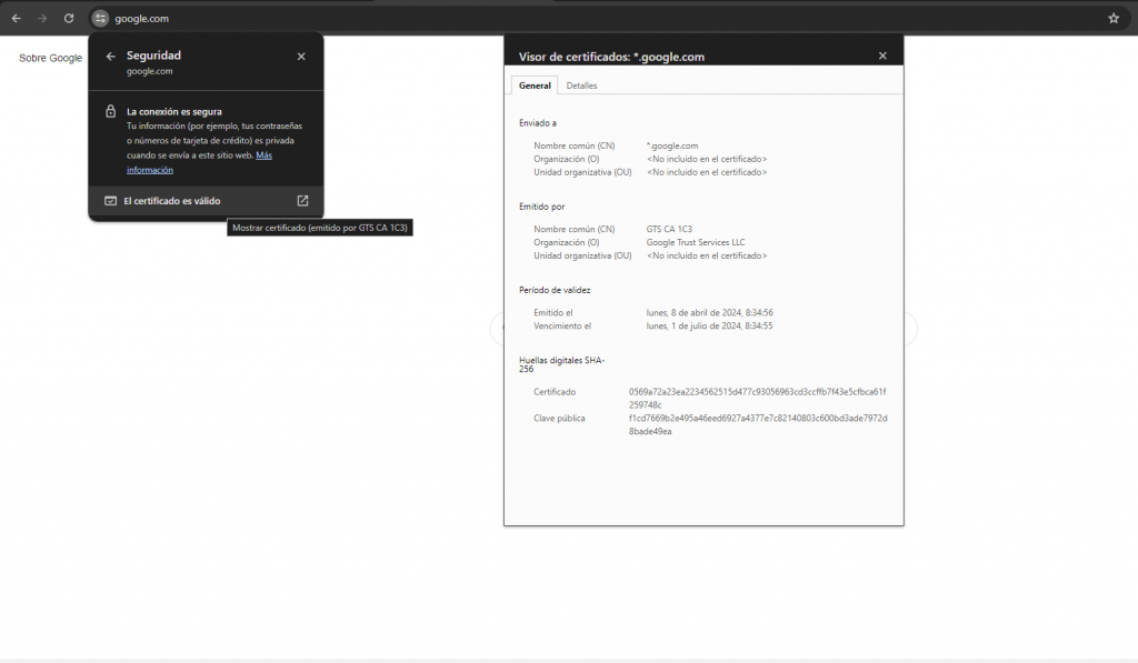 En las comunicaciones mediante TLS -antes SSL- el servidor dispone de un certificado TLS. El certificado TLS es un elemento facilmente accesible, como se muestra en la imagen, utilizado para crea confianza en un sitio web. En la web actual, deberemos desconfiar de cualquier página o servicio que no tenga candado. Es decir, que no use TLS: